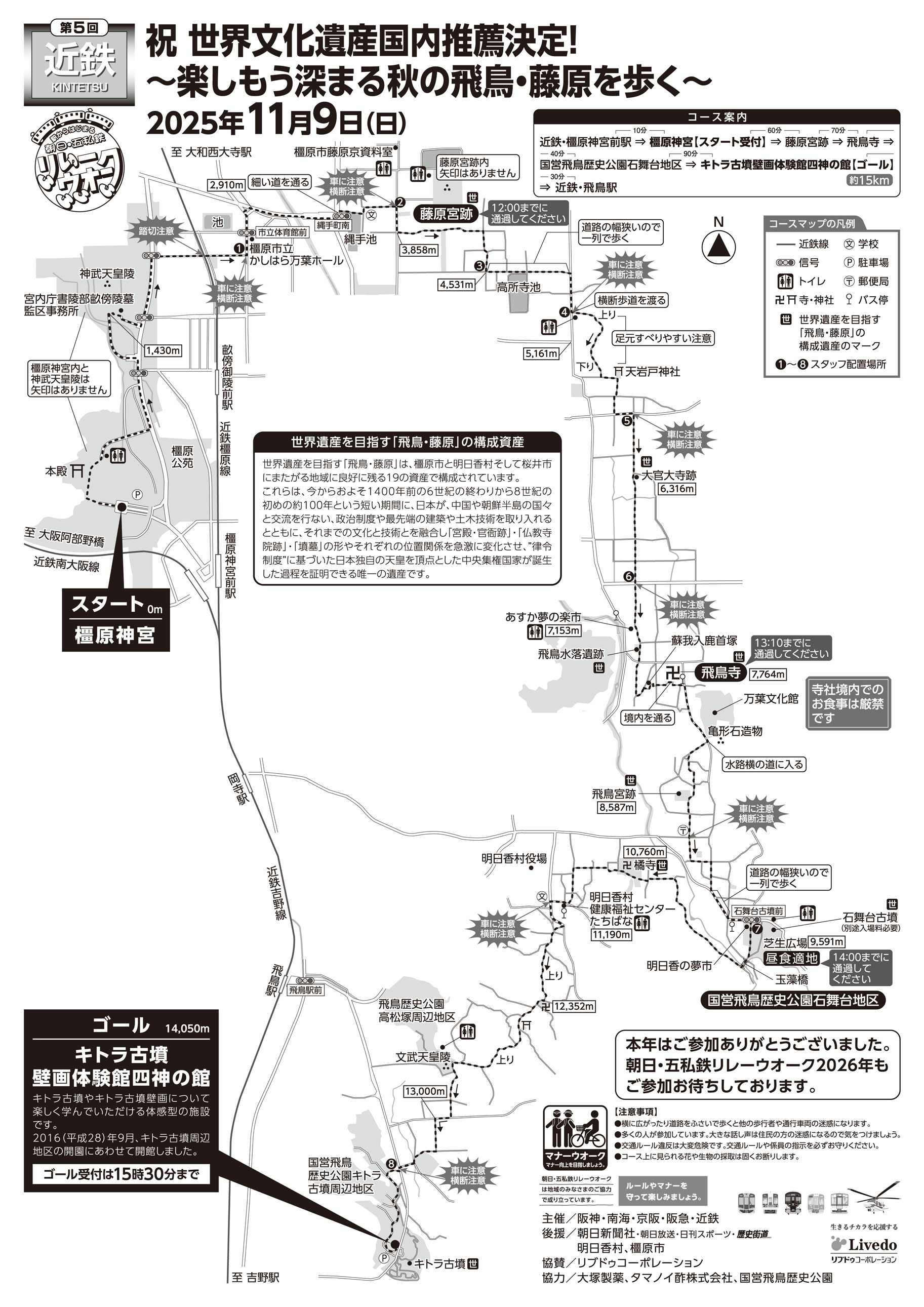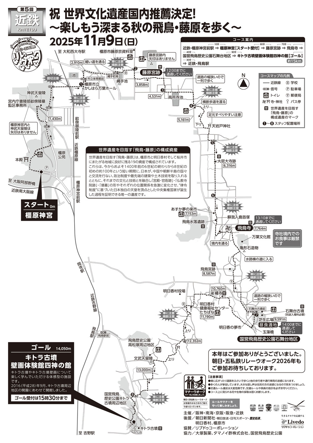 近鉄・橿原神宮前駅⇒橿原神宮(かしはらじんぐう)[スタート受付]⇒藤原宮跡(ふじわらきゅうせき)⇒飛鳥寺(あすかでら)⇒国営飛鳥歴史公園石舞台地区⇒キトラ古墳壁画体験館四神の館[ゴール]…近鉄・飛鳥駅