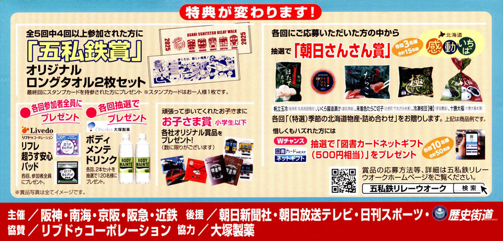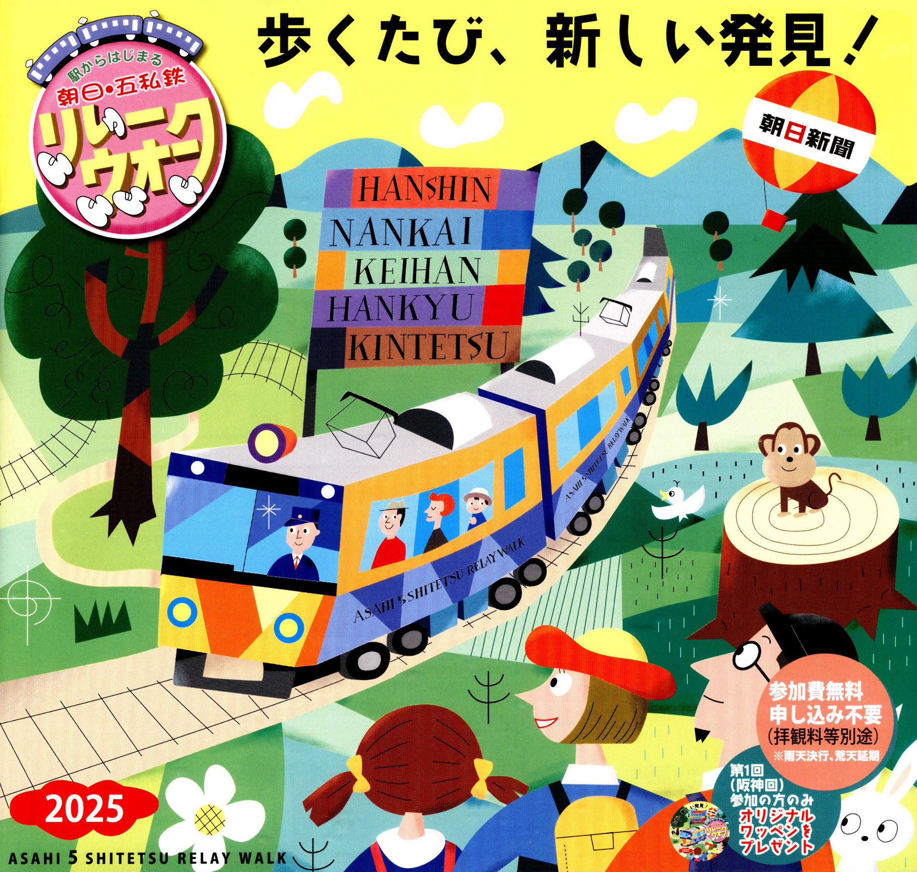 朝日・五私鉄リレーウォーク:関西にある私鉄5社、阪急電鉄・近畿日本鉄道(近鉄)・阪神電車・京阪電車・南海電鉄が主催、朝日新聞社・朝日放送・日刊スポーツが後援の参加費無料(交通費・入園料などは各自負担)申し込み不要のウォーキングイベントです。
