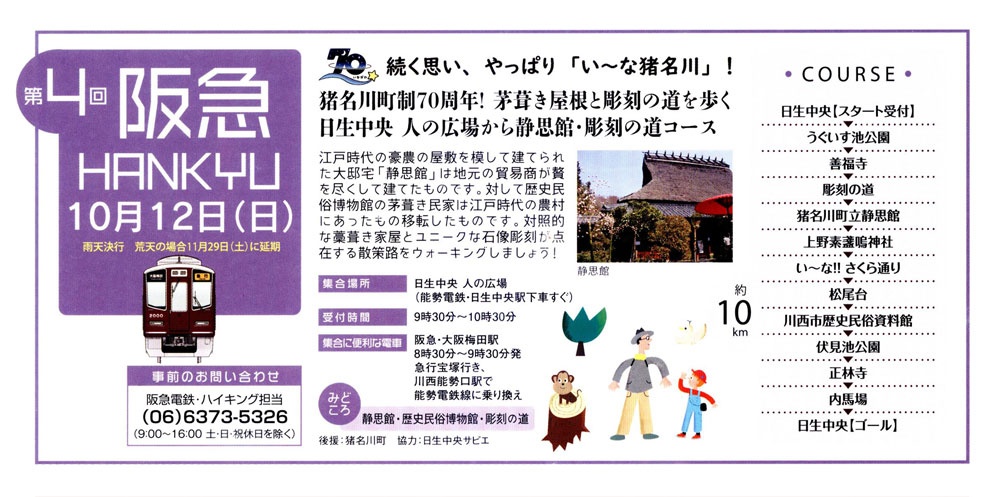 日生(にっせい)中央[スタート受付]⇒うぐいす池公園⇒善福寺(ぜんぷくじ)⇒彫刻の道⇒猪名川町立静思館(せいしかん)⇒上野素盞嗚神社(すさのおじんじゃ)⇒い~な!!さくら通り⇒松尾台⇒川西市歴史民俗資料館⇒伏見池公園⇒正林寺(しょうりんじ)⇒内馬場(うちばば)⇒日生中央[ゴール]